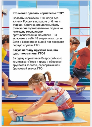Программа «Готов к труду и обороне» (ГТО) приносит школьникам многочисленные преимущества, способствуя развитию всесторонне подготовленных и здоровых молодых людей:Программа «Готов к труду и обороне» (ГТО) приносит школьникам многочисленные преимущества, способствуя развитию всесторонне подготовленных и здоровых молодых людей: 1. Улучшение физической формы Выполнение нормативов ГТО стимулирует школьников заниматься регулярными тренировками, что ведет к повышению уровня физической подготовки. Школьники становятся сильнее, быстрее, гибче и выносливее, лучше справляются с учебными нагрузками и повседневными делами. 2. Предотвращение ожирения и гиподинамии В условиях современного образа жизни, насыщенного гаджетами и сидячими развлечениями, ГТО служит эффективным способом борьбы с недостатком двигательной активности и проблемами лишнего веса. Программа вовлекает подростков в активные виды спорта, помогая избежать последствий малоподвижного образа жизни. 3. Закалка организма и профилактика заболеваний Постоянные физические нагрузки повышают иммунитет, улучшают работу сердца и сосудов, стимулируют обмен веществ и нормализуют гормональный фон. Благодаря этому школьники реже болеют простудными заболеваниями, меньше подвержены хроническим болезням, легче переносят стрессы и эмоциональные перегрузки. 4. Психологическая устойчивость и уверенность в себе Участие в программах ГТО способствует развитию самодисциплины, уверенности в собственных силах и способностей. Полученные медали и знаки отличия являются предметом гордости и дополнительным стимулом для дальнейшего совершенствования своих возможностей. 5. Патриотическое воспитание Сдача норм ГТО приобщает школьников к традициям советской эпохи, формировавшим мощное поколение патриотов, готовых служить Отечеству. Современные школьники ощущают причастность к великим историческим свершениям нашей страны, испытывают гордость за её прошлое и настоящее. 6. Акцент на командной работе и взаимовыручке Соревнования по ГТО часто проводятся в групповом формате, где участники поддерживают друг друга, работают совместно над достижением общих целей. Это учит подростков взаимопомощи, уважительному отношению к окружающим и пониманию ценности коллектива.
